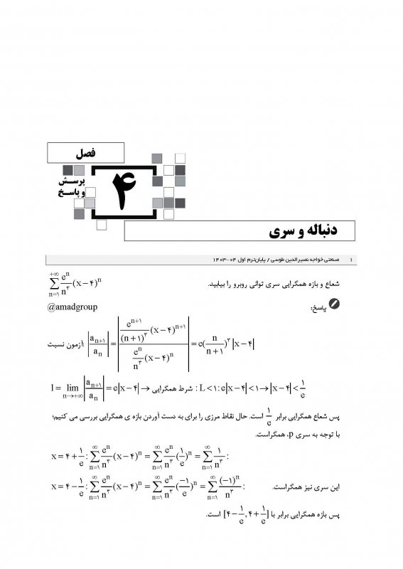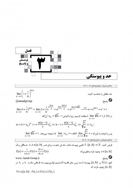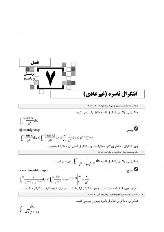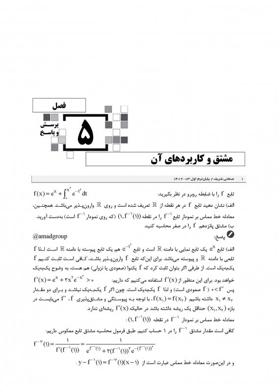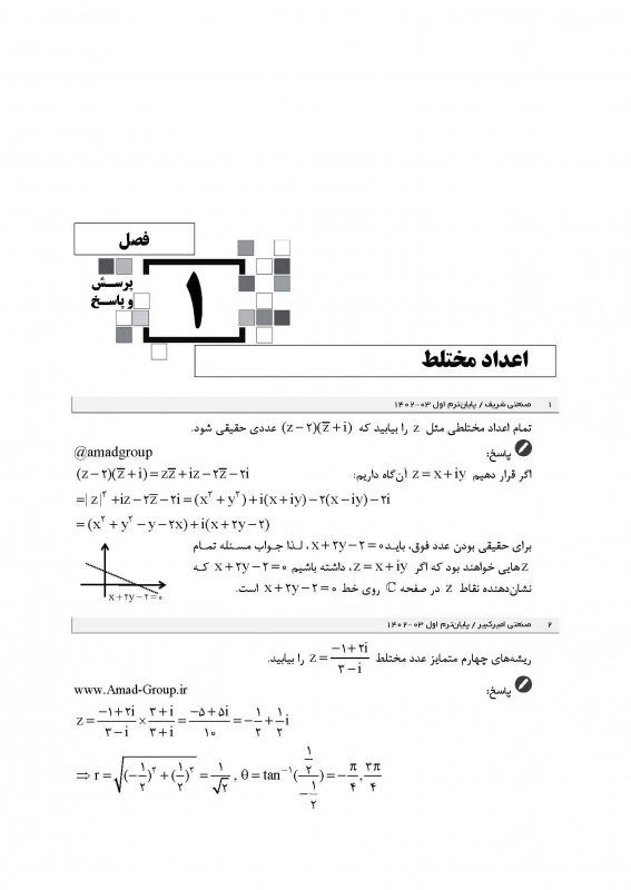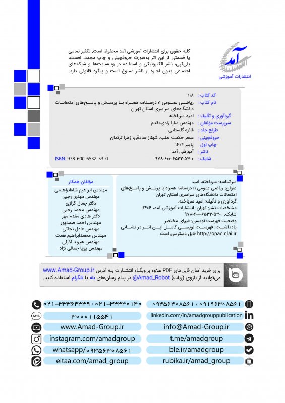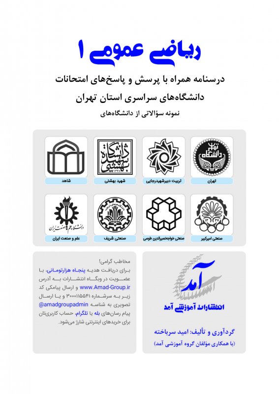 اين كتاب در قطع وزيری، 160 صفحه، قيمت 4000000 ريال شامل 7 فصل همراه با درسنامه رنگی، شامل پرسشها و پاسخهای درس رياضی عمومی 1 دانشگاههای سراسری از جمله علم و صنعت ايران، صنعتی اميركبير، صنعتی شريف، تهران، صنعتی خواجه نصير الدين طوسی، تربيت دبير شهيد رجايی، شهيد بهشتی، شاهد میباشد كه در برگيرنده امتحانات پايانترم و ميانترم است. فصلهای اعداد مختلط، تابع، حد و پيوستگی، دنباله و سری، مشتق و كاربردهای آن، انتگرال و كاربردهای آن و انتگرال ناسره (غيرعادی) در كتاب درج شده اند.